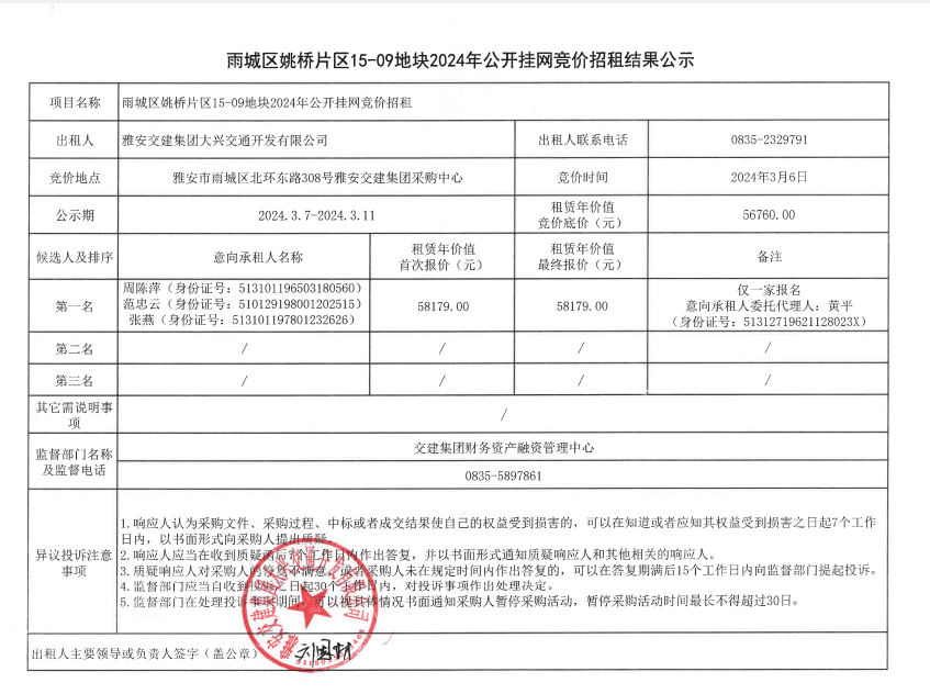雨城区姚桥片区15-09竞价招租结果公示