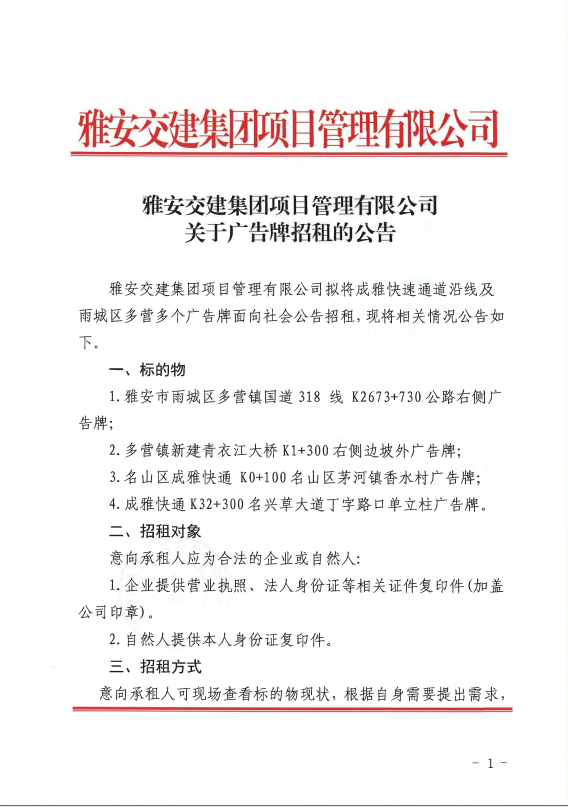 大红鹰dhy(中国)集团项目管理有限公司关于广告牌招租的公告