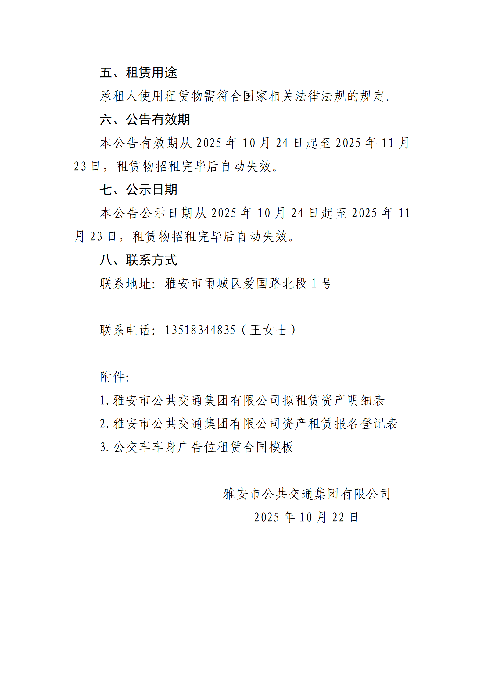 雅安市公共交通集团有限公司 关于150辆公交车车身广告位整体挂网招租的公告