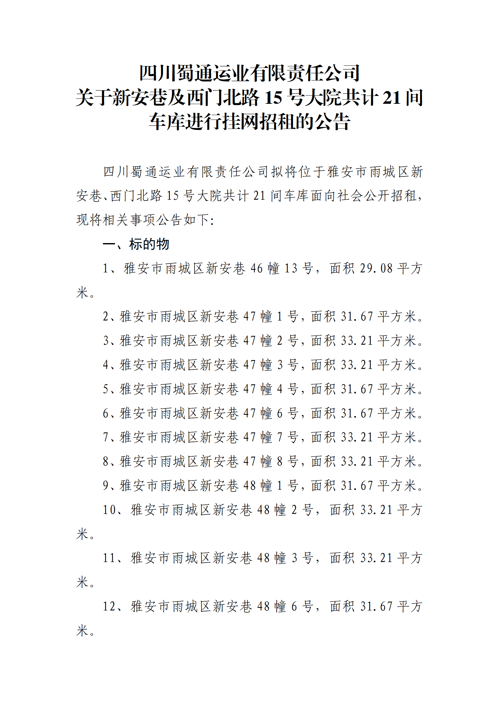 四川蜀通运业有限责任公司 关于新安巷及西门北路15号大院共计21间车库进行挂网招租的公告