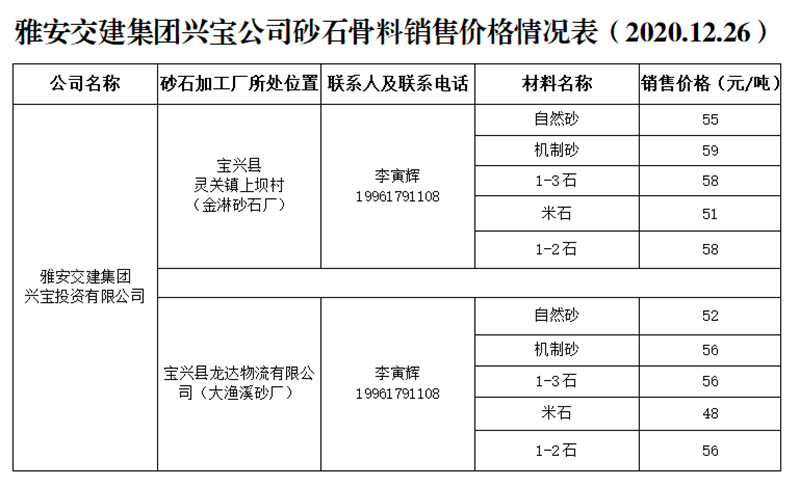 大红鹰dhy(中国)集团兴宝公司砂石骨料销售价格情况表(2020.12.26)