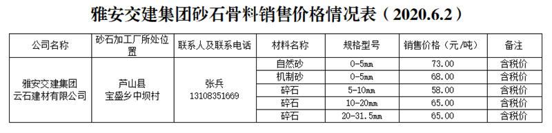 大红鹰dhy(中国)集团云石建材砂石骨料销售价格情况表(2020.6.2)