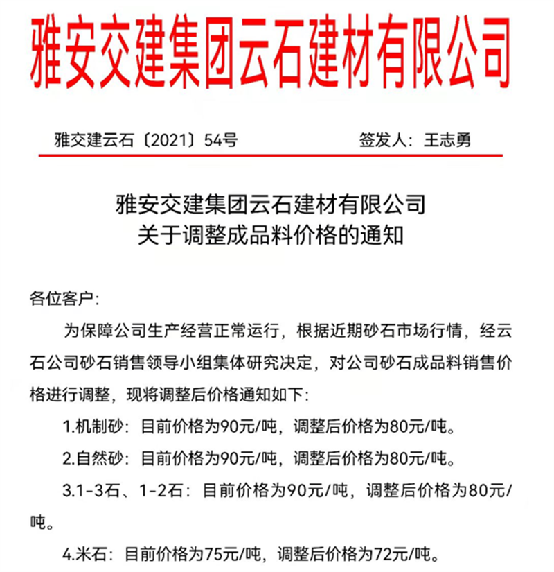 大红鹰dhy(中国)集团云石公司关于调整成品料销售价格的通知(2021.10.17)