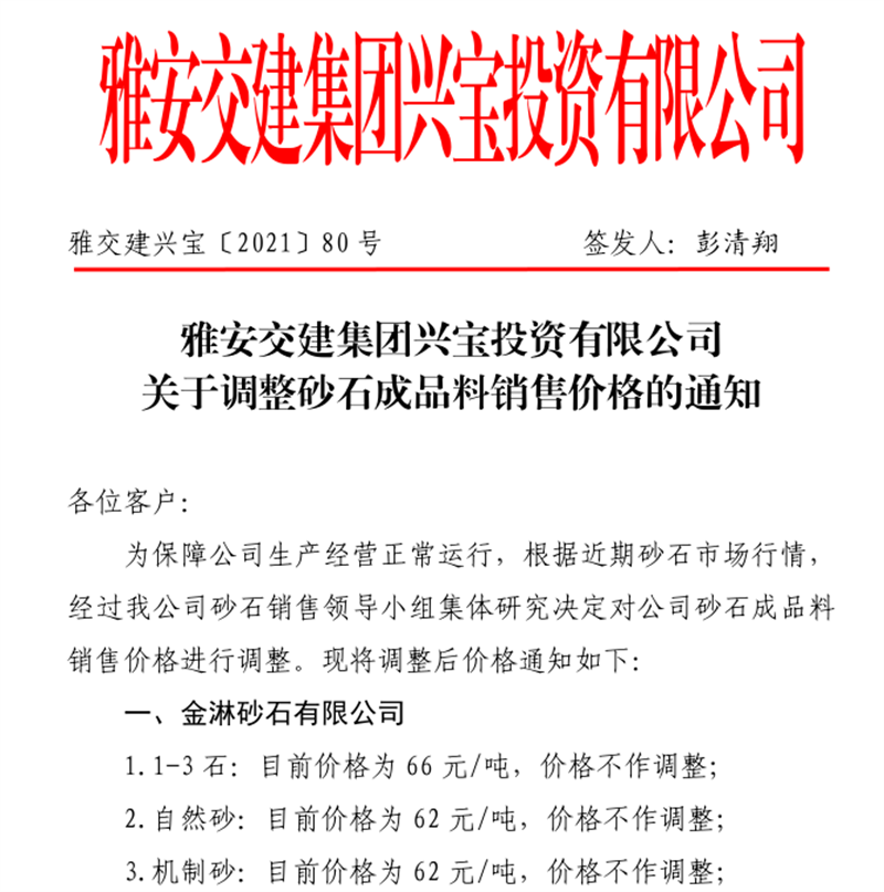 大红鹰dhy(中国)集团云石公司关于调整成品料销售价格的通知(2021.11.4)
