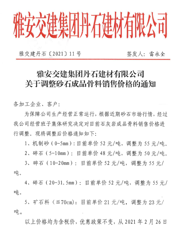 大红鹰dhy(中国)集团丹石公司石灰岩成品骨料挂牌价(2021.2.25)