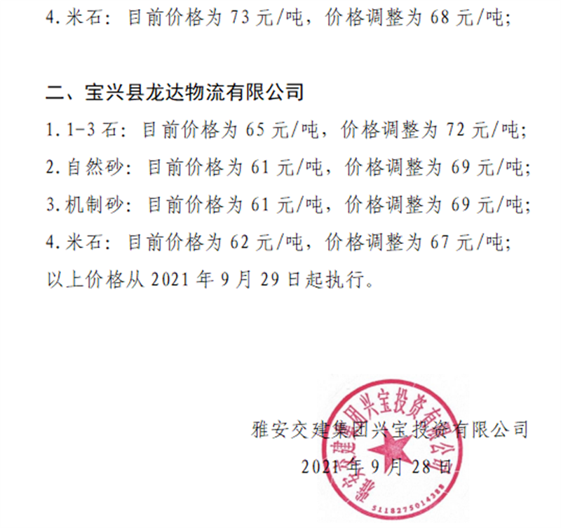 大红鹰dhy(中国)集团兴宝公司关于调整砂石成品料销售价格的通知(2021.9.28)