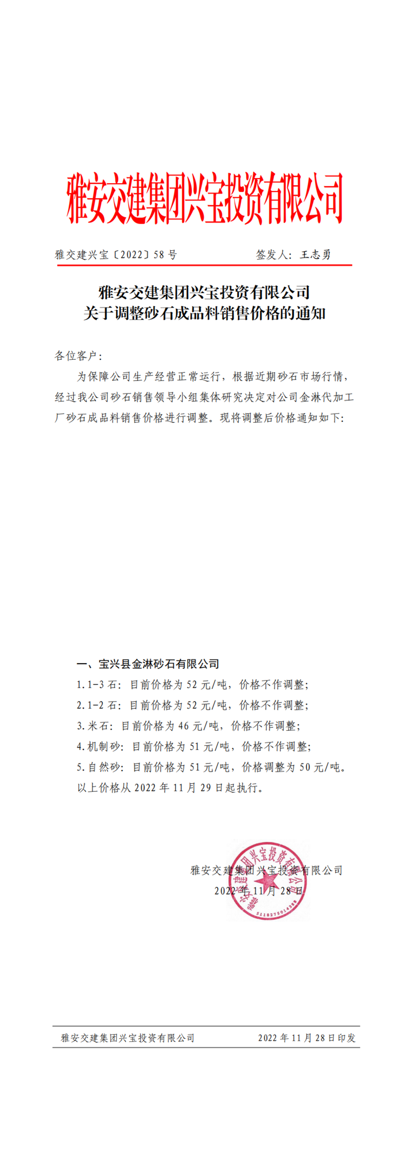 雅交建兴宝〔2022〕58号 关于调整砂石成品料销售价格的通知