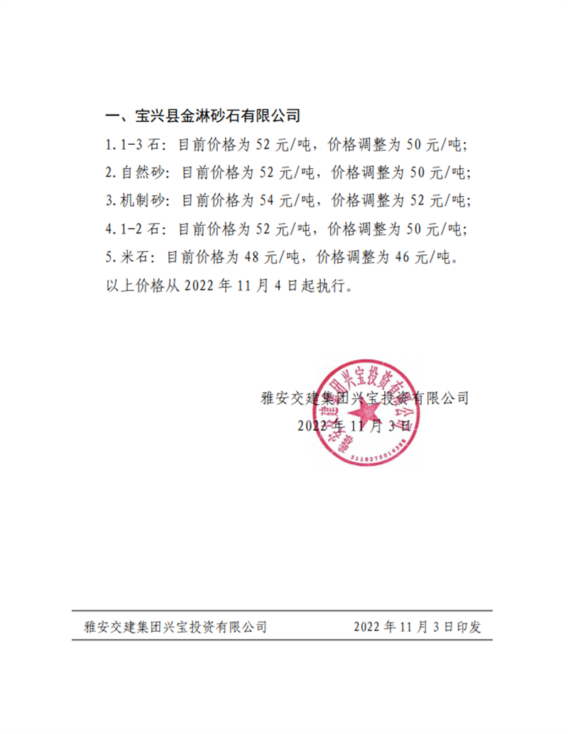 雅交建兴宝〔2022〕55号 关于调整砂石成品料销售价格的通知-11.5