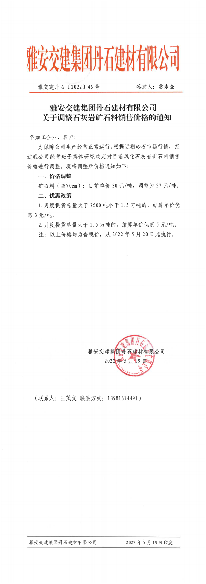 大红鹰dhy(中国)集团丹石公司关于调整石灰岩矿石料价格的通知-2022-5-19