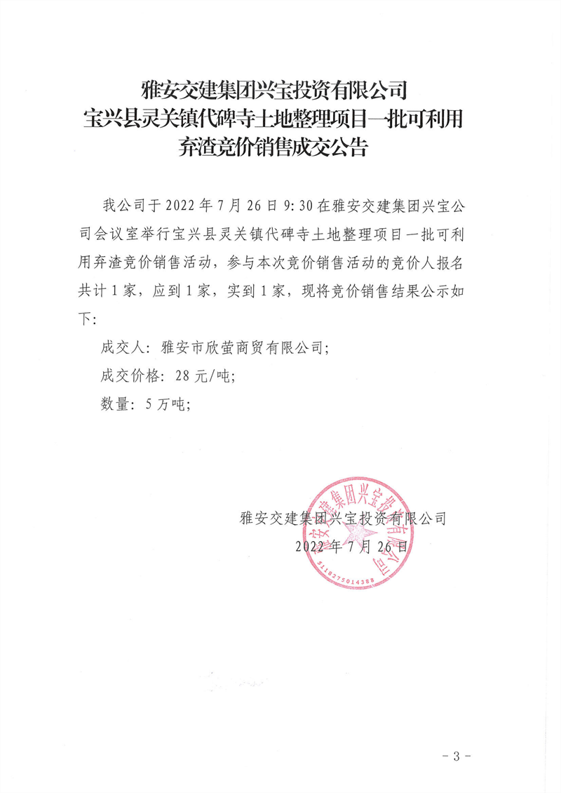 宝兴县灵关镇代碑寺土地整理项目一批可利用弃渣竞价销售成交公告7.26(5万吨)