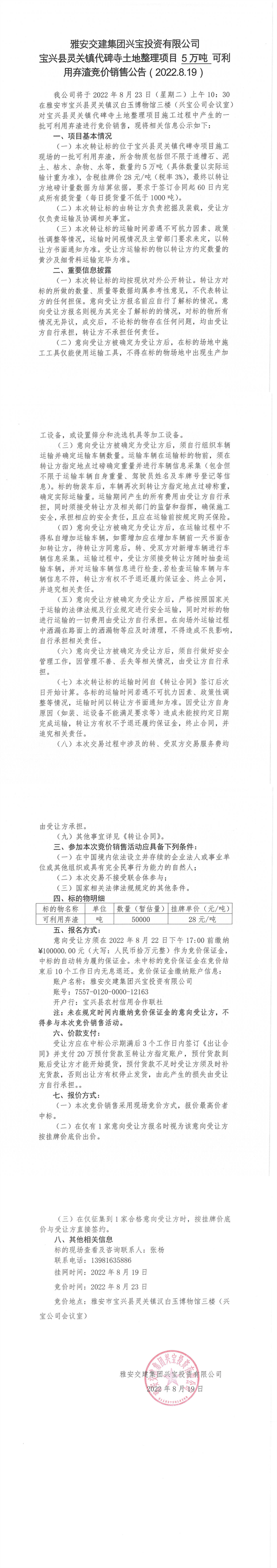 大红鹰dhy(中国)集团兴宝投资有限公司灵关镇代碑寺土地整理项目5万吨可利用弃渣竞价销售公告(2022.8.19)(1)