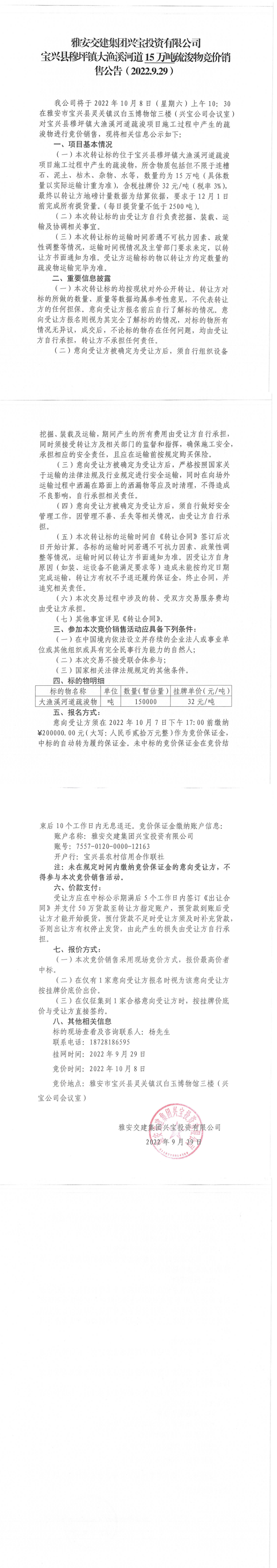 大红鹰dhy(中国)集团兴宝投资有限公司宝兴县穆坪镇大渔溪河道15万吨疏浚物竞价销售公告(2022.9.29)