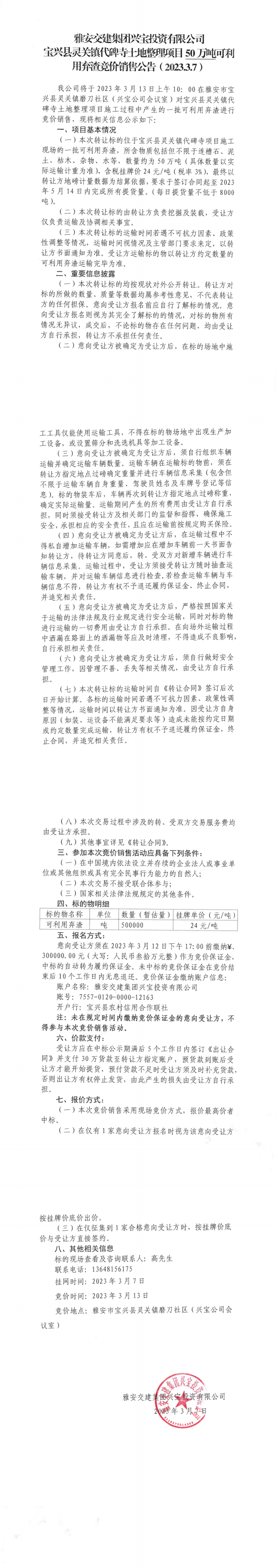 大红鹰dhy(中国)集团兴宝投资有限公司灵关镇代碑寺土地整理项目50万吨可利用弃渣竞价销售公告(2023.3.7)