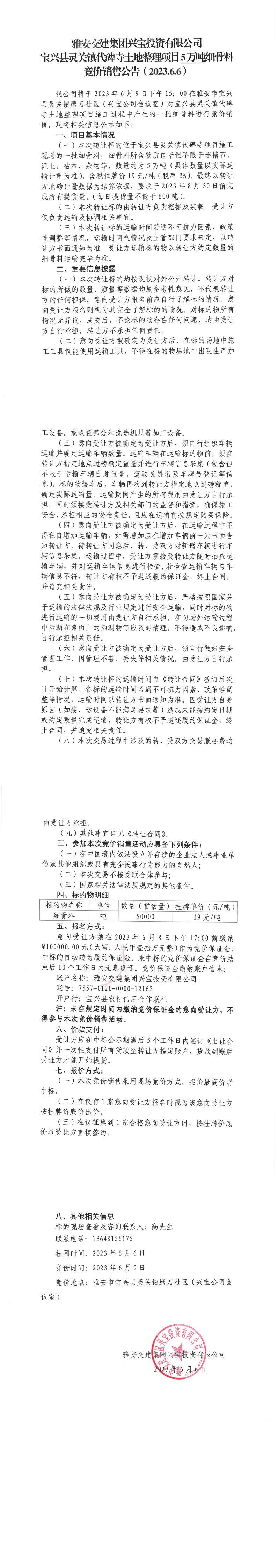 大红鹰dhy(中国)集团兴宝投资有限公司宝兴县灵关镇代碑寺土地整理项目5万吨细骨料竞价销售公告(2023.6.6)