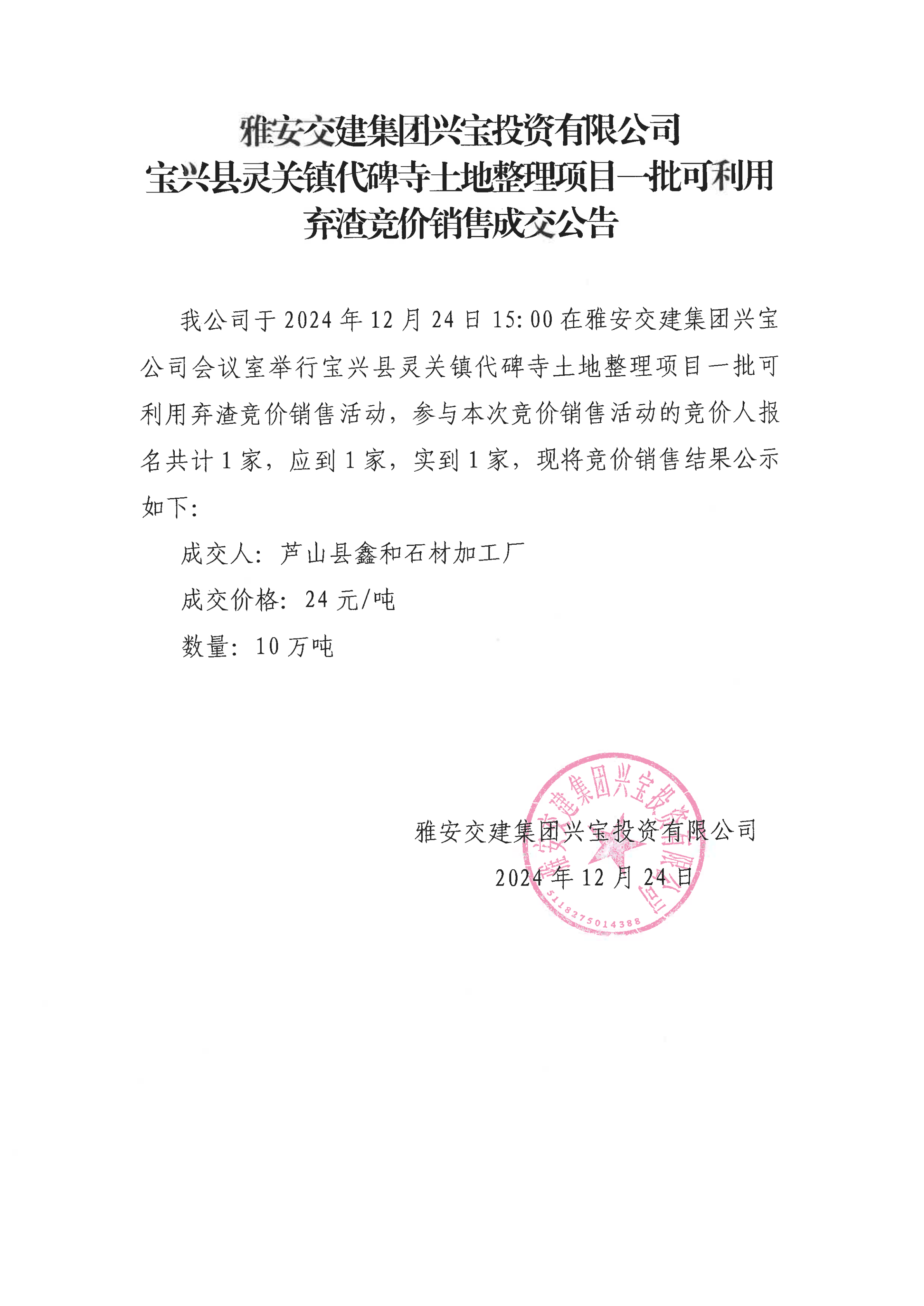 大红鹰dhy(中国)集团兴宝投资有限公司灵关镇代碑寺土地整理项目5万吨可利用弃渣成交公告(2024.12.24)